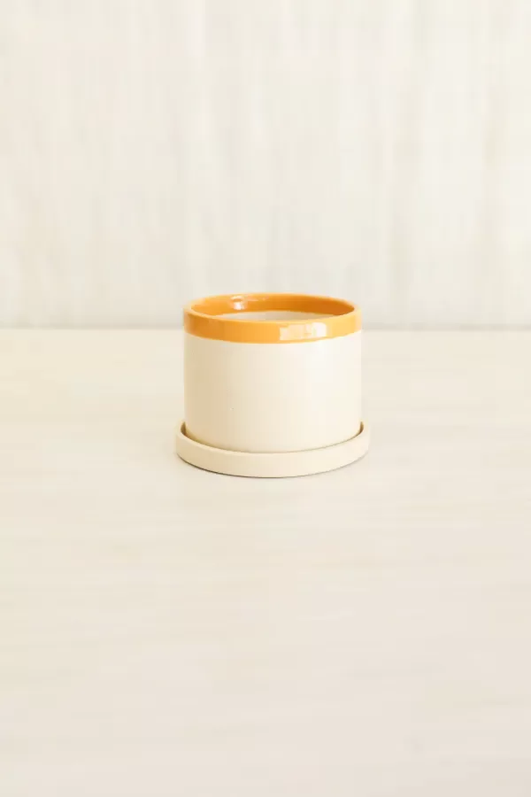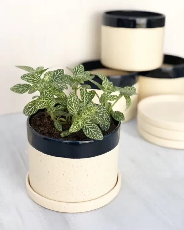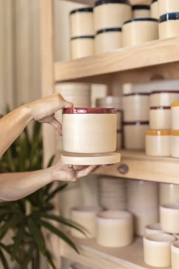 Maceta cilíndrica de cerámica esmaltada a mano.