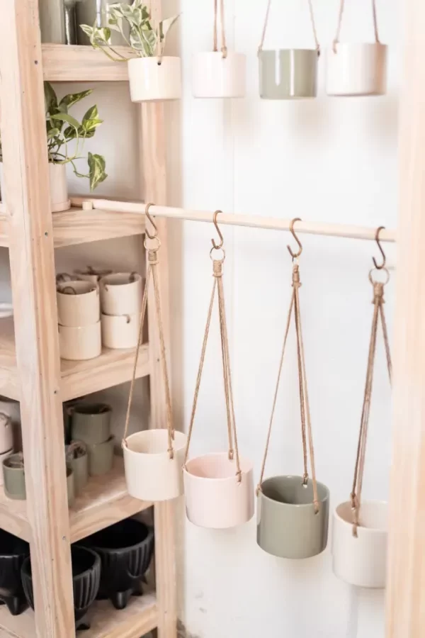 Maceta Colgante de cerámica esmaltada a mano, con 3 tiras de cordón de yute y argolla metálica