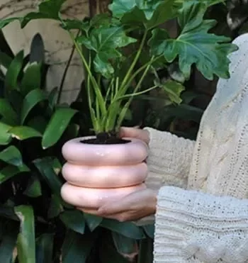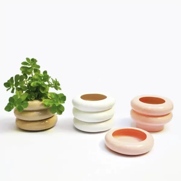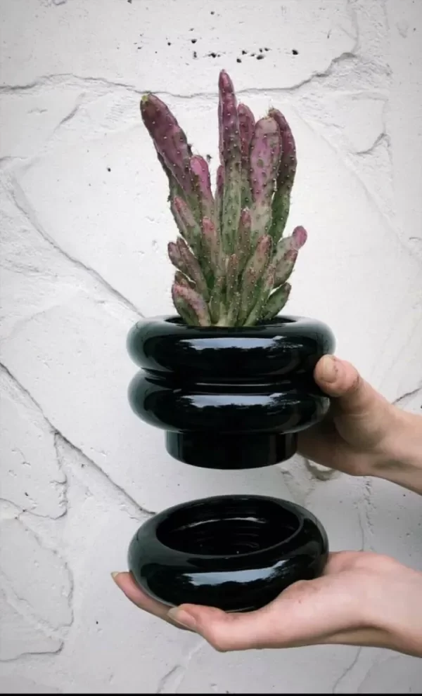 Es una maceta de cerámica ondulada con un plato que se integra de forma camuflada.